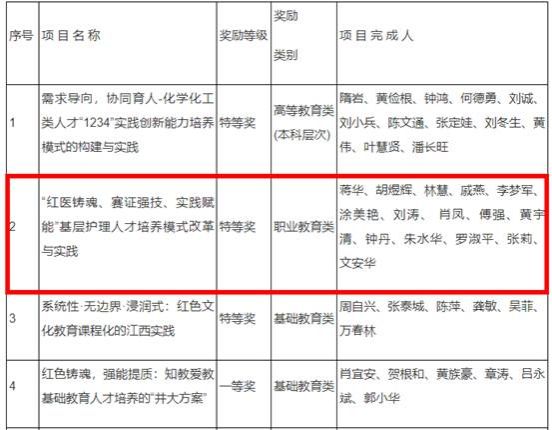 近日,江西省人民政府公布了2022年江西省教学成果奖评选结果,护理学院蒋华副教授主持的《“红医铸魂、赛证强技、实践赋能”基层护理人才培养模式改革与实践》荣获特等奖。