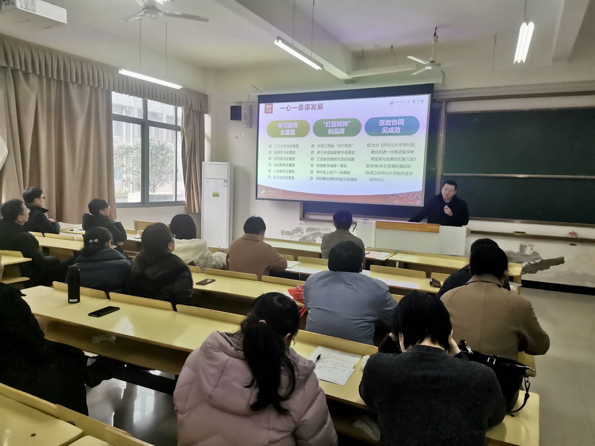廖岚强调,要认清形势把握机遇,大力提升内涵建设,提高学部显示度、贡献度,进而提升获得感和幸福感。就如何推动学部高质量跨越式发展,廖岚强调,要顺势而为,医学教育事业发展要与国家发展道路同向而行;要贯彻落实学校党委三届三次全体(扩大)会议精神,无缝对接“五大攻坚行动”,开展有组织的科研、教学、管理、民生和服务工作;要努力拼搏,提升个人能力,做一个靠谱的人,做一个执行果敢的人,做一个敢于勇敢尝试的人,做一个勤于思考的人;要用事业凝聚人,营造干事创业良好氛围,以“大红”发扬红色基因,以“大气”打开格局,以“大力”拼搏奋进,以“大爱”无私奉献,以“大美”创造我们共同的美丽井大。