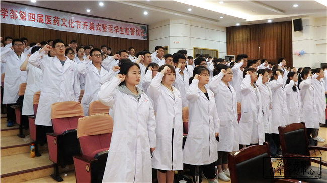 开幕式上学生代表17预防本1班邹涯霏表示同学们将会以最饱满的热情参与到各项活动的开展中,充分利用医药文化节这一平台,将第一课堂与第二课堂结合,通过参与各项活动来检验知识技能,拓宽视野,激发专业热情。在17护理本1班周芸旭的带领下,全体同学庄严宣读医学誓词 。