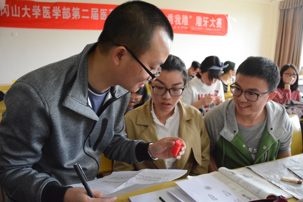 比赛分为5个环节:参赛选手现场就坐,主持人介绍比赛规则,工作人员发放比赛所需工具,嘉宾老师进行现场口腔义诊指导,优秀作品评选并宣布比赛成绩。比赛环节,专业组雕刻下颌第一磨牙,非专业组雕刻上颌中切牙。专业组的参赛选手们淡定自如,雕刻出来的作品的确远胜非专业组。但是经过老师现场的建议和指导,非专业组的选手们也在有条不紊地进行着。经过一个多小时的时间,选手们交上了自己最终的参赛作品。评委老师们在仔细专业的观察比较以后进行打分,选出了获奖的小组作品:专业组一等奖14口腔本一程新、康佳小组;二等奖14口腔本一陈佳娜、琚田娟小组,杨娜、李乔乔小组;三等奖14口腔本一杨娜、李乔乔小组,刘艳、师上桀小组,曾雯、王泽宇小组,15口腔本二刘卫琪、匡蕤希小组;非专业组优秀奖15预防本一许锦坤、应明小组,16口腔本一刘金婵、贾超小组,王露露、杨丽娟小组。